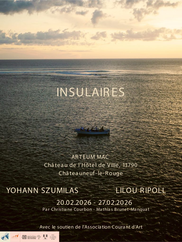 INSULAIRES Lilou Ripoll et Yohann Szumilas Cette exposition invite à explorer les univers intimes, sensibles et poétiques de deux artistes émergents, chacun profondément lié à une forme d’insularité – géographique, culturelle ou intérieure. L’île y est vue comme un espace paradoxal : lieu de retrait et de solitude, mais aussi de résilience, d’ouverture et de passages permanents. Deux regards se croisent et dialoguent autour de ce thème universel. Lilou Ripoll – Une ode vibrante à la Corse Originaire d’une famille d’artistes corses, Lilou Ripoll puise son inspiration dans les paysages bruts et la mémoire vivante de son île natale. Formée dès l’enfance à la peinture à l’huile, au fusain et au pastel, titulaire d’un DEM de piano, elle crée des œuvres multisensorielles où se mêlent dessins, peintures et installations. Yohann Szumilas – Contrastes insulaires : beauté et réalité Né à Port-au-Prince (Haïti) en 2002, adopté en France, et récemment marqué par un séjour à l’Île Maurice, Yohann Szumilas est photographe et réalisateur basé à Paris. Fondateur de la FLAKEANDBODY depuis 2018, il a rejoint en 2023 l’équipe des photographes de Vogue.Son travail capture les dualités des mondes insulaires : splendeur des paysages naturels versus fragilités socio-économiques. À travers photographies et vidéos, il juxtapose l’idéal et le réel, l’émerveillement et la dureté du quotidien. À découvrir dans l’exposition : Dessins évoquant horizons, végétation et reliefs insulaires Installations immersives mêlant sons (piano, ambiances) et formes visuelles Photographies et vidéos fragments du quotidien insulaire, où beauté et réalités sociales se confrontent INSULAIRES questionne comment l’insularité nourrit l’imaginaire, façonne l’identité et influence la création contemporaine. Elle crée un beau pont entre îles et continent, invitant à la réflexion et au dialogue culturel. Que vous soyez amateur d’art, habitant, touriste ou professionnel, INSULAIRES vous promet une immersion poétique au cœur des territoires insulaires et de leurs richesses symboliques. Exposition du 20 au 27 février 2026 Visites du mardi au dimanche de 10h à 18h Commissariat : Mathias Brunet-Manquat Avec le soutien de Christiane Courbon, directrice de ARTEUM MAC. Partenaires : ARTEUM • Courant d’Art • Département 13 • Châteauneuf-le-Rouge • PAC Au programme Visites guidées pour plonger dans les thèmes de l’insularitéAteliers artistiques inspirés des techniques des artistes et des cultures insulairesImmersions sensorielles avec sons et images pour ressentir l’atmosphère des îles